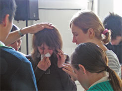 city of Tours for the Lord. We also did outreach at an open-air market in a Muslim area right in front of an Islamic bookseller with people in full Muslim dress walking all around us. You could definitely feel the warfare in the air. Amazingly enough, in spite of the tough spiritual conditions in France, which is one of the most resistant countries in a resistant continent already, we had some very positive, powerful, and miraculous responses, encounters, and happenings. We had quite a number of people from the streets who responded positively and who came to the evening meeting, some came every night to every meeting we did! This truly was miraculous, especially in a place like France. One young lady in particular named Celine from Belgium was on a spiritual pilgrimage to Spain. We met her on the street and she came to the evening meeting and received Christ. She then asked to stay with the youth group at the church and joined the team the next day passing out tracts and invitations on the street with us! She delayed her journey and stayed with us three days, coming to every meeting and joining in the praising, dancing, and worship as God poured out His Spirit. She said her life would never be the same!!! Another man who came from the street received Christ; he then asked for prayer and was filled powerfully with the Holy Spirit and was even slain in the Spirit as God filled this new believer with His love and power!!! Around nine people made decisions for Christ as we reached out, which for France is quite "grande" (huge!). |