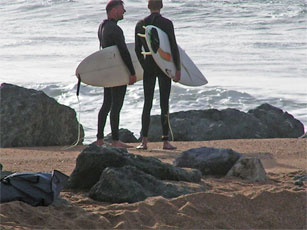 the coastal area of France after the camp/seminar in Tours. One was with a couple who were on their honeymoon. We met them in a surf shop in Hossegor, France. We were just browsing in this shop when the Holy Spirit spoke to my heart to wait there in the shop. The shop was getting ready to close and the people running it were wanting to go lunch but I knew God had something planned. Right before they were about to push us out the door as we were stalling around waiting on the Lord, this couple walked in and we immediately connected with them and spent considerable time talking with them outside. Hours later on that same day we were pulling up in a parking lot in a different town when that same couple pulled up at the exact same moment! We looked at each other in surprise. Mercedes and I knew the Lord wanted us to reach out to them. God opened up an opportunity to share and witness to them in depth for a couple of hours hanging out on the beach. We continued to run into them over the next couple of days and shared the Gospel extensively with them. It was a dramatic ongoing divine appointment where we planted many seeds. We also gave them our "Holy Ghost Surf Stories" DVD's to continue the seed planting in their lives. It is nice to now have some of our own relevant follow-up materials for situations like this. There was another man we kept running into as well: after two encounters on the coast of France we were shocked to walk straight into him on a street in Spain! We had felt led to come to Spain for a couple days and were blessed in numerous ways including this divine appointment with this Englishman and other people we witnessed to there, as well as some great surf. We knew God put this Englishman in our path after something so amazing, and shared with him and others the Good News of Christ. |