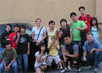 Bryan, Mercedes and Patrick leading some songs at the kids' service in Tijuana. MIDDLE: Bryan prays over a young Korean named Christie as she prays over an elderly Hispanic woman. RIGHT: With the Korean youth group who came down to Mexico for the weekend to join in ministering. |