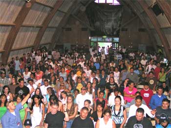 ![]() Youth Camp up in the mountains with the approximately 430 young people who showed up crammed into a meeting hall with many still overflowing out the back door. |