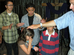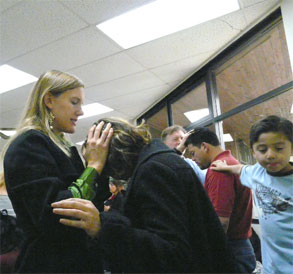 Left: Some teens and young children get radically filled with the Holy Spirit in Hesperia in the Inland Empire. Middle: Praying as the Holy Spirit moves at a meeting at USC (University of Southern California). Right: Preaching in Santa Maria, Calif. at Freedom Crusade Fellowship. |